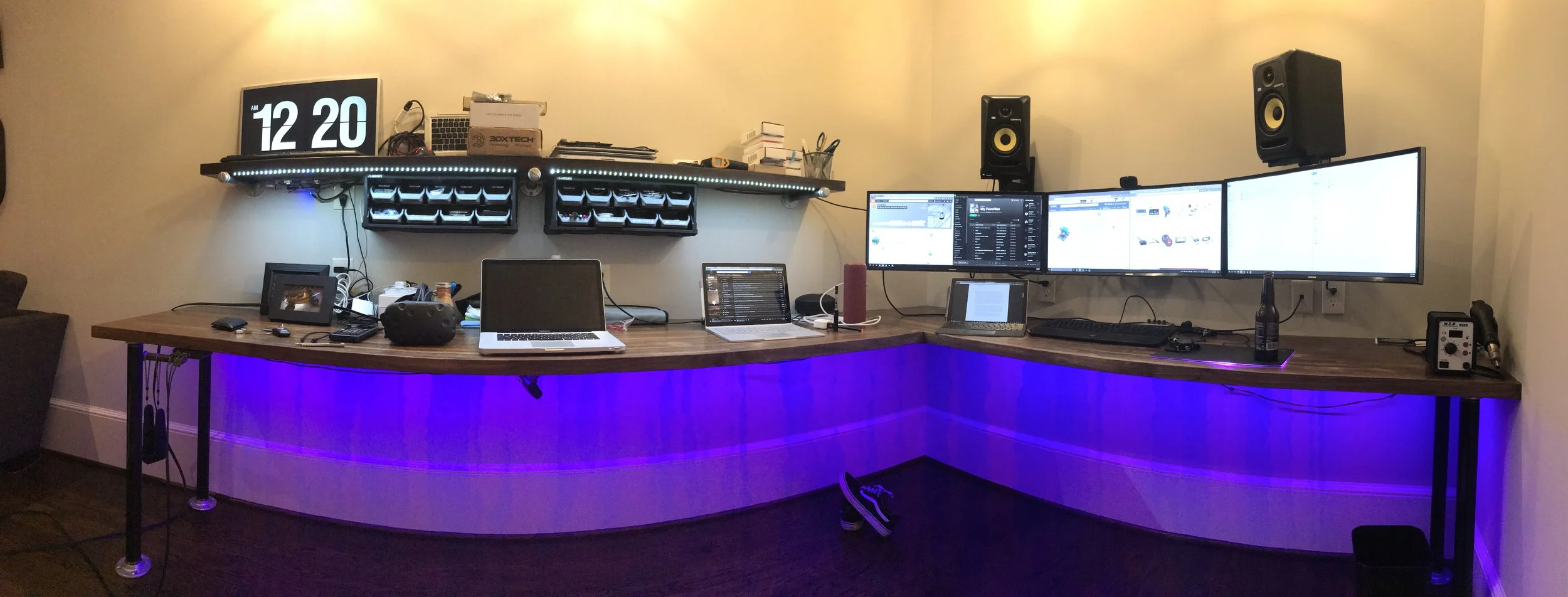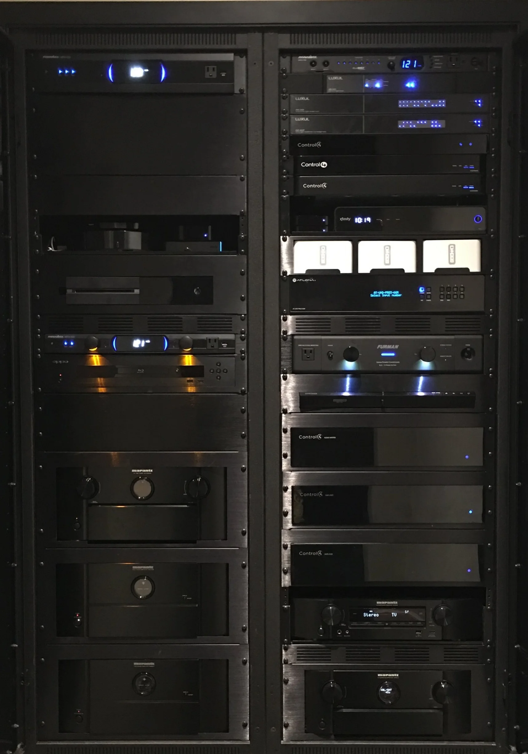 A year of careful design and planning led to the final A/V Server Rack above. This contains 3 Networking Switches with POE injection for 7 WiFi Access Points, 1 Network Router, 4 power conditioners, 1 six by six HDMI Matrix, 3 Control4 Processors, 1 IO Extender, 2 4K Blue ray players, 3 Apple TV's, 2 cable boxes, 1 Roku 4, 1 Xbox One, 3 Sonos connect, 3 six channel audio amplifiers, 2 receivers, 1 Atmos Pre-Amp and 2 powered amplifiers.